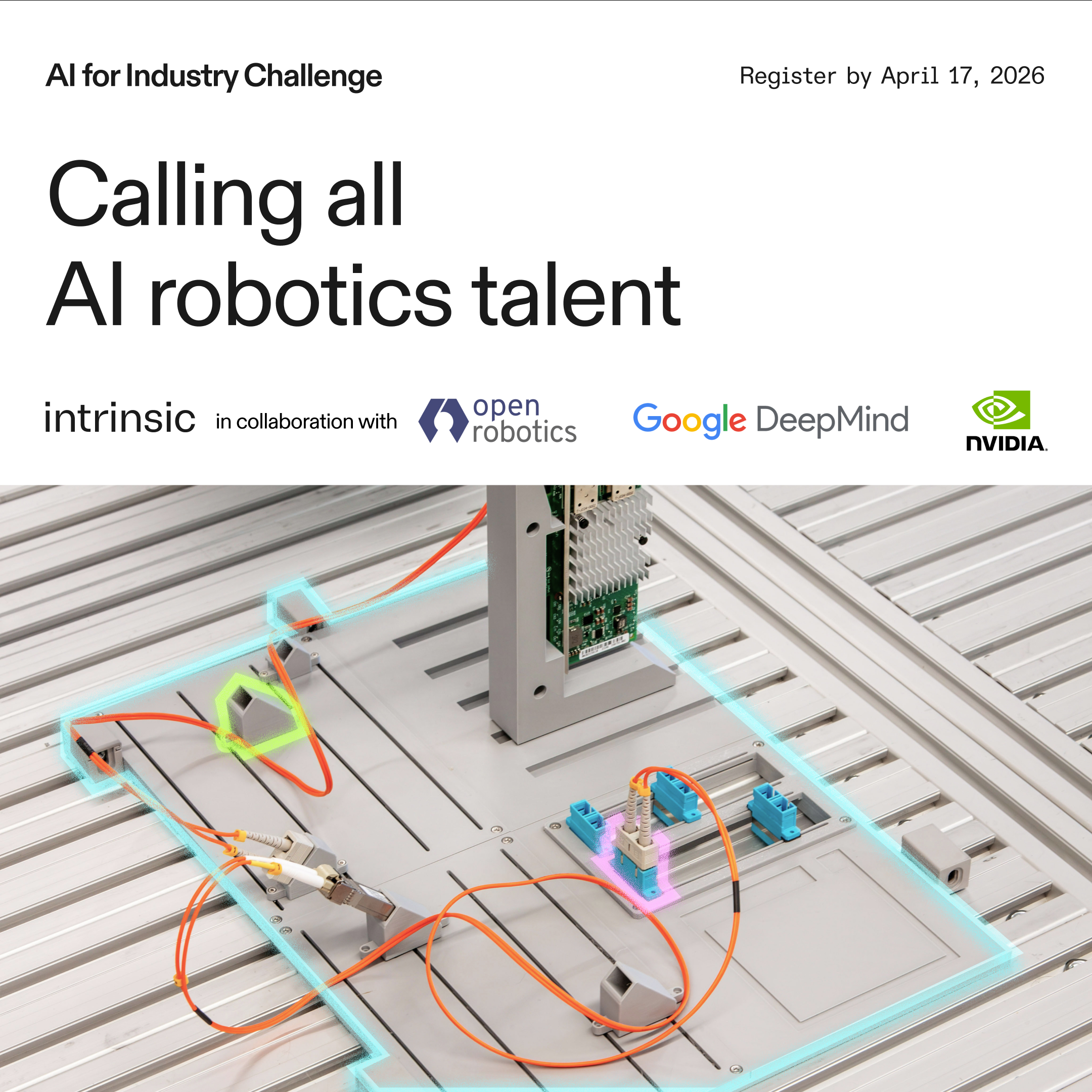 Intrinsic and Open Robotics proudly present theThe AI for Industry Challenge. Developed in collaboration with Nvidia and Google DeepMind, the program is designed to transform the industrial landscape.It’s an open challenge inviting developers, engineers, roboticists, and research teams to apply the latest in AI, simulation, and robotic control to a real-world dexterous task that has challenged both academia and industry for years. Participants in the AI for Industry Challenge will help innovate and push forward the solution for intelligent robotic manufacturing.